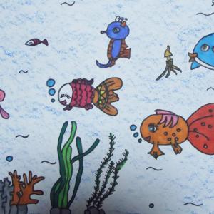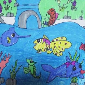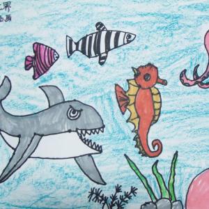 圆梦画室初级班学生在第4节课“水中精灵”课后,创作的以海底世界为主题的彩笔画作品。