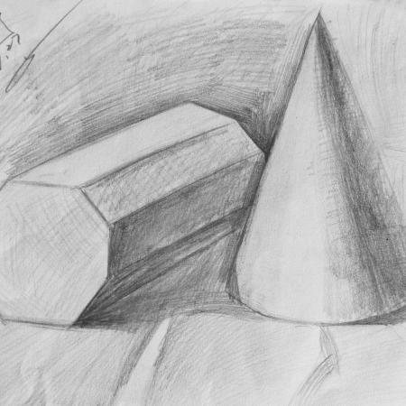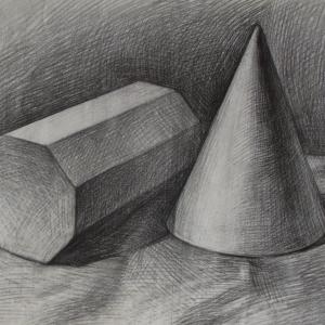 以前我们学习了单个几何体的画法,从这节课开始,我们以圆锥体和八棱柱组合写生画法为例,进一步认识和学习两个以上的石膏几何体的素描表现方法。