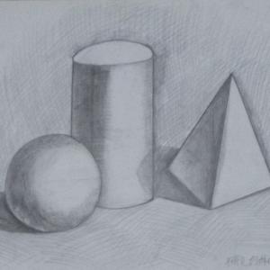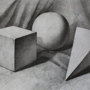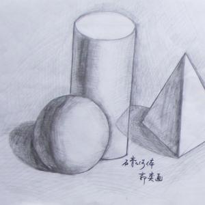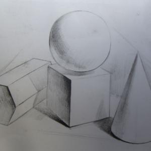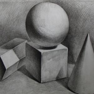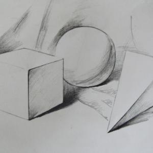 上一周我们学习了两个石膏几何体的画法,这一周,我们以球体、正方体、四棱锥体为例,进一步学习三个石膏几何体组合的画法。