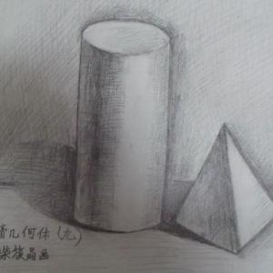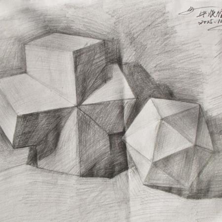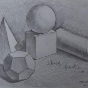 提高班的学生正在学习素描石膏几何体的画法,已经练习了单个或两个圆柱体、球体、棱锥、棱柱、十二面体、组合体等画法,这是第15周部分学生的课堂作业展示。
