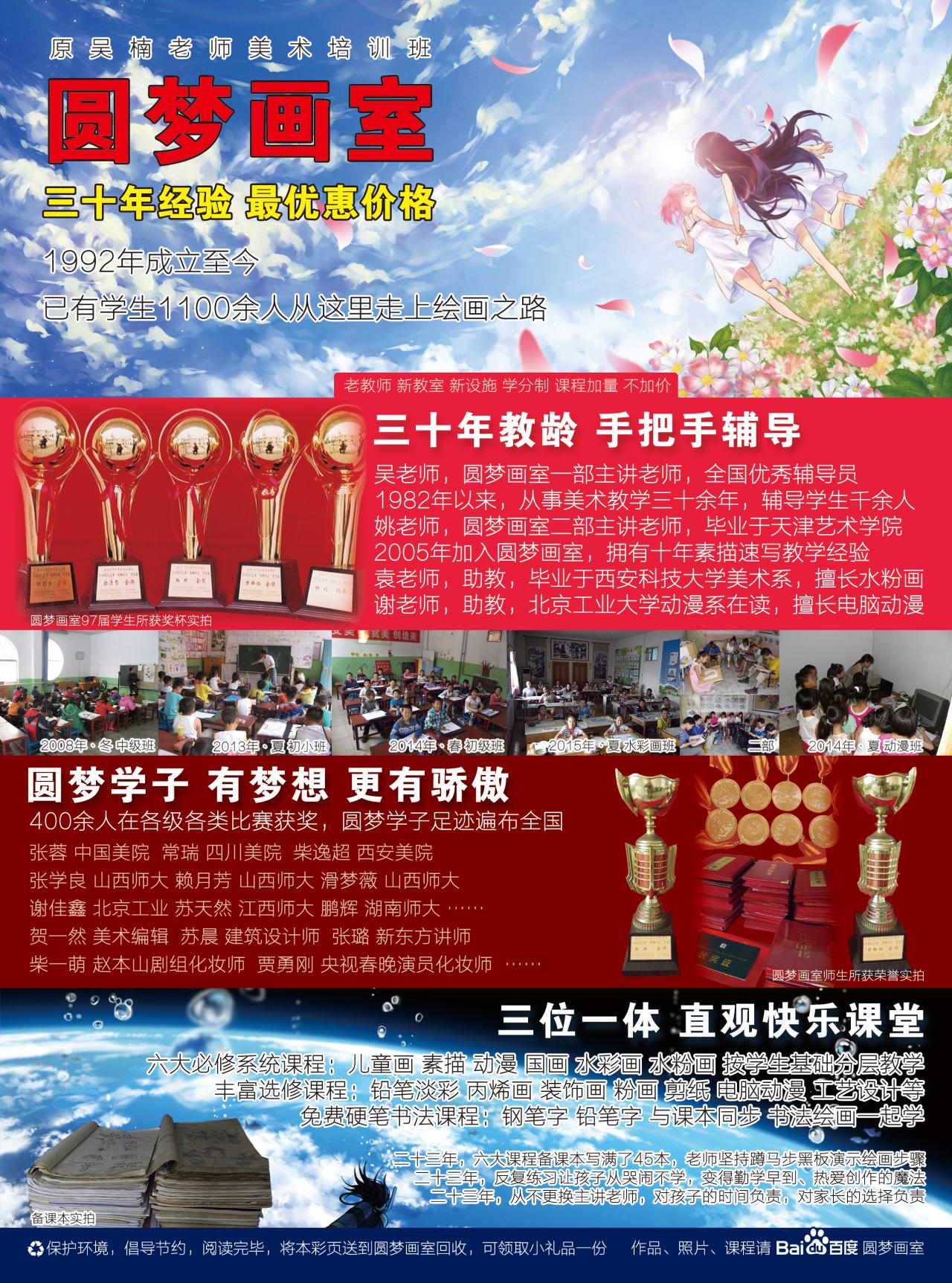 圆梦画室创建于1992年,设绘画、书法、作业三部,共11班,高级教师多名,校舍540平方米,内设千兆网络,空调,投影。绘画部设儿童画、素描、水粉、水彩、动漫,国画六大系统课程,学生可选修彩铅、装饰画、剪纸、工艺美术等课程。书法部设铅笔字,钢笔字和毛笔书法。作业部邀请退休教师任教,打造河津原创教育培训品牌。